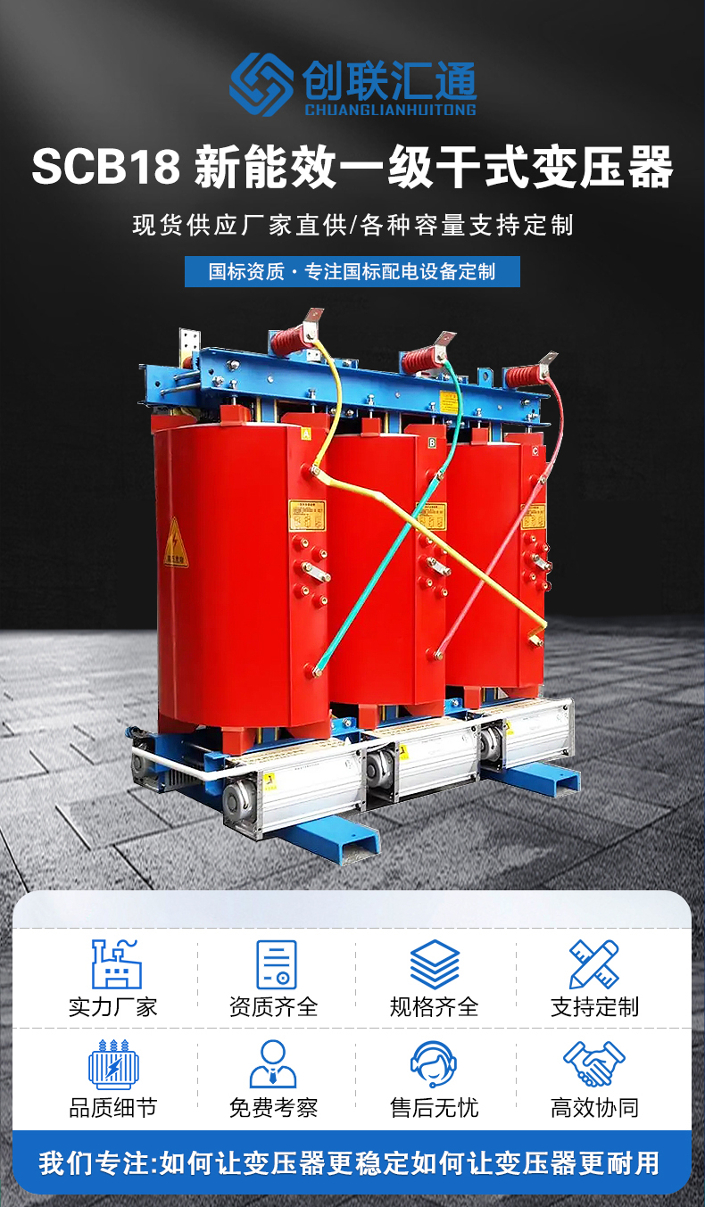 SCB18干式變壓器是符合《GB20052-2020電力變壓器能效限定值及能效等級國家標準》一級能效標準的新型號干式變壓器,是節能電力變壓器。SCB18變壓器相較SCB14變壓器空載損耗降低20%,負載損耗保持不變。