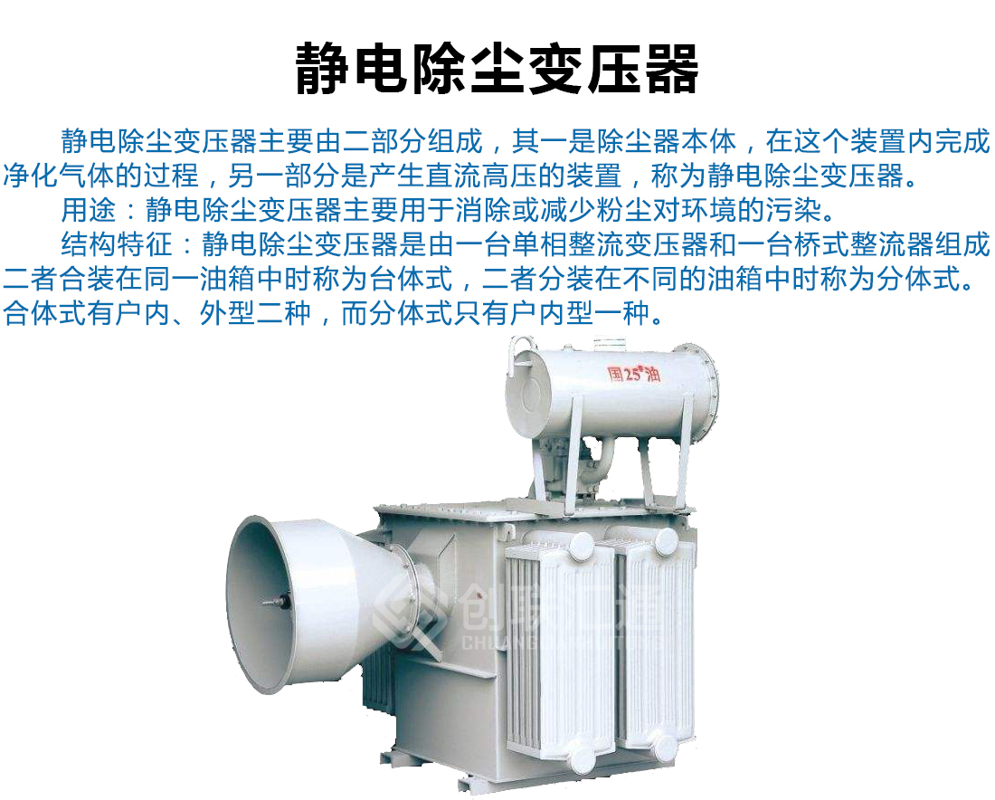 靜電除塵變壓器是由一臺單相整流變壓器和一臺橋式整流器組成。二者合裝在同一油箱中時稱為臺體式,二者分裝在不同的油箱中時稱為分體式。合體式有戶內、外型二種,而分體式只有戶內型一種。  變壓器自身為高阻抗變壓器。高壓硅堆采用雪崩高壓硅堆,抗沖擊能力強,反向擊穿后能自動恢復。采樣電阻采用可靠性很高的產品。變壓器高壓交流端與高壓硅堆采用全橋接線方式。